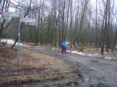 Hier lag noch Schnee. Ich ohne Schneeketten. Eine kleine Rutschparie begann auf den ersten 600 Metern.